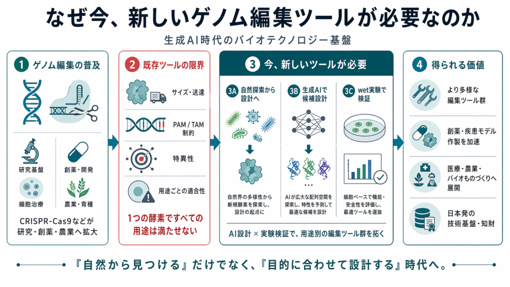 これらの超小型編集ツールは、AAV搭載性、設計自由度、送達適性という観点から、in vivoゲノム編集医療における重要な技術基盤となる可能性があります。ただし、自然界に存在する酵素をそのまま使うだけでは、標的認識性、活性、安全性、編集効率などに課題が残る場合があります。したがって、自然探索と人工設計を組み合わせ、目的に応じた新しい編集ツールを開発することが重要になります。